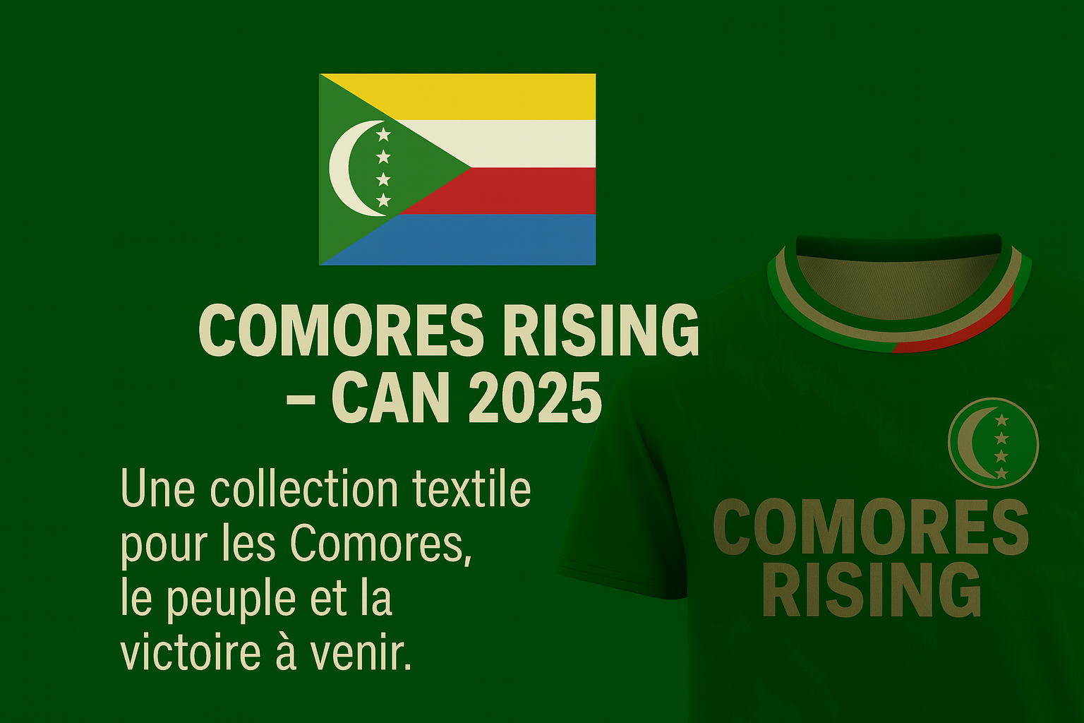 COMORES RISING – CAN 2025** C'est une capsule textile dédiée à la fierté comorienne et à la qualification historique à la CAN. Maillots, t-shirts, sacs, chaussures : chaque pièce incarne l’union entre style, mémoire et militantisme. **REIGN DSTRKT** célèbre ici l’archipel, sa jeunesse, et sa victoire en devenir.--->L’histoire est en jeu. Le style aussi.